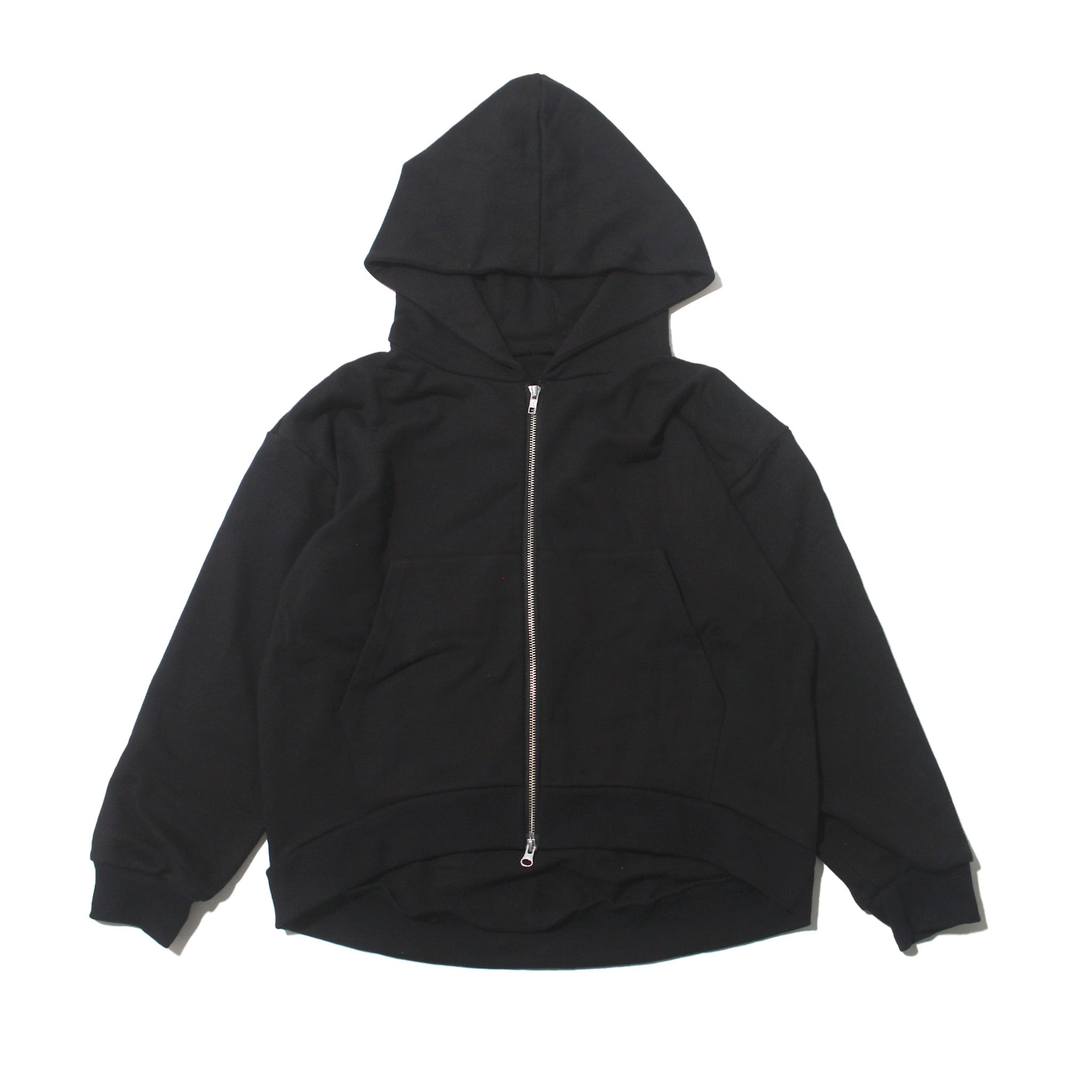 やわらかな裏毛素材を使用しており、着心地に優れています。フロントのジップがデザインアクセントになっています。